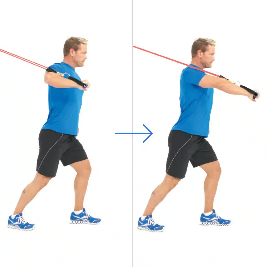 - Setup: Anchor the resistance band securely behind you at chest level. Hold one end of the band in each hand.